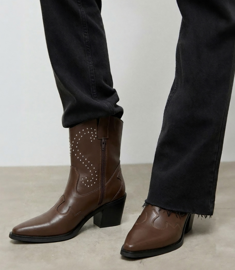 Texana de color chocolate con tachas metálicas. Un clásico con actitud, ideal para realzar cualquier look.