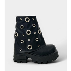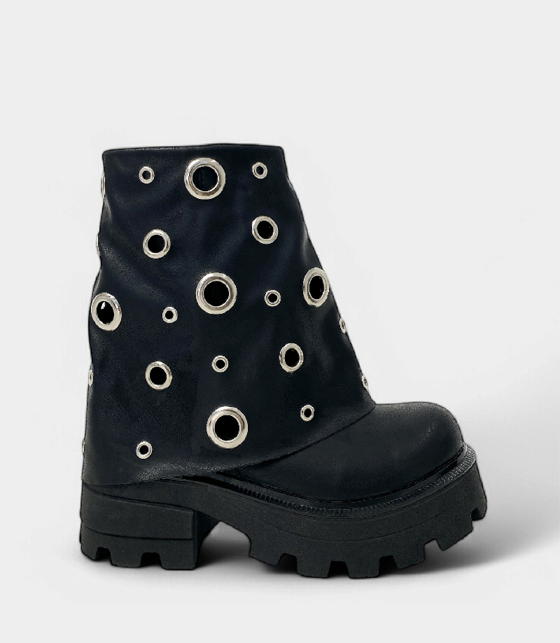 Negro, con base alta y caña cubierta de ojalillos metálicos. Borcego con mucha personalidad, ideal para levantar cualquier look con actitud y un toque dosmilero.