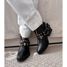 Detalle: Correas con tachas y argollas plateadas que destacan el diseño.
