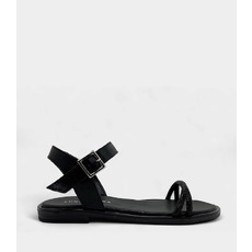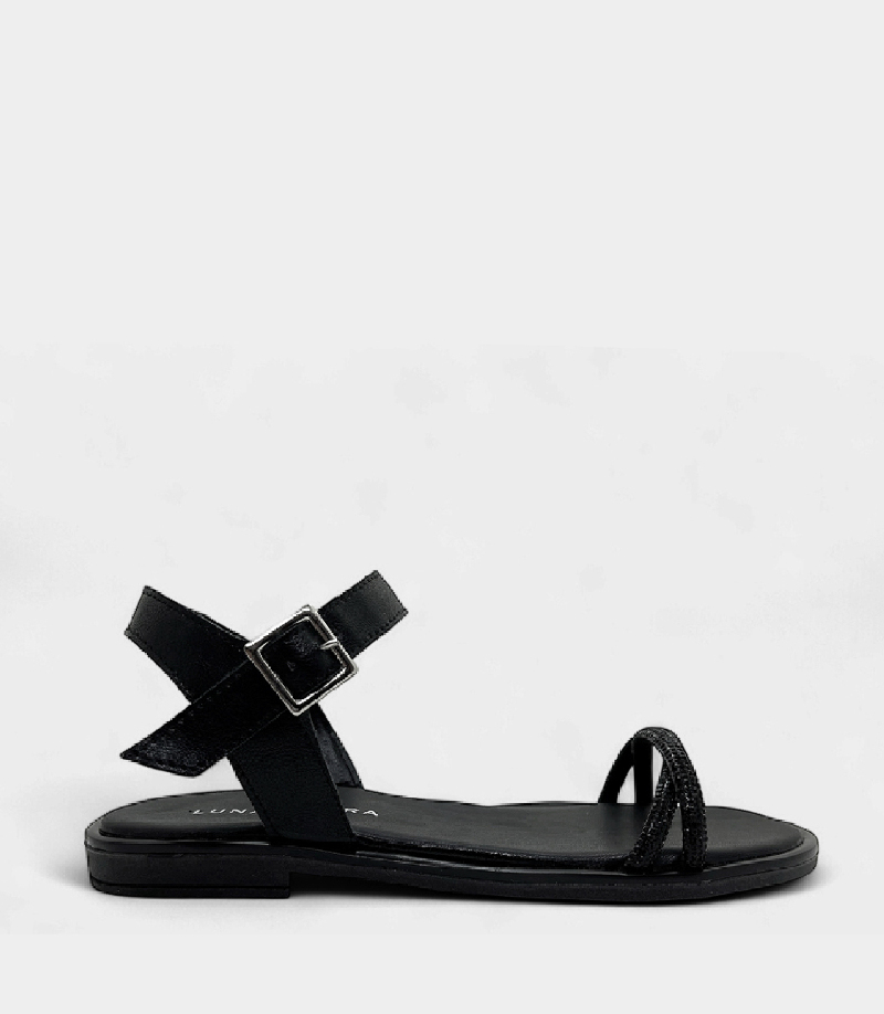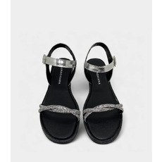 Esta sandalia plana destaca por su diseño minimalista y sofisticado. La capellada presenta tiras finas con strass entrelazadas sobre el frente, complementadas por una pulsera al tobillo con hebilla metálica que asegura un calce firme y cómodo. Disponible en negro, plata y nude.